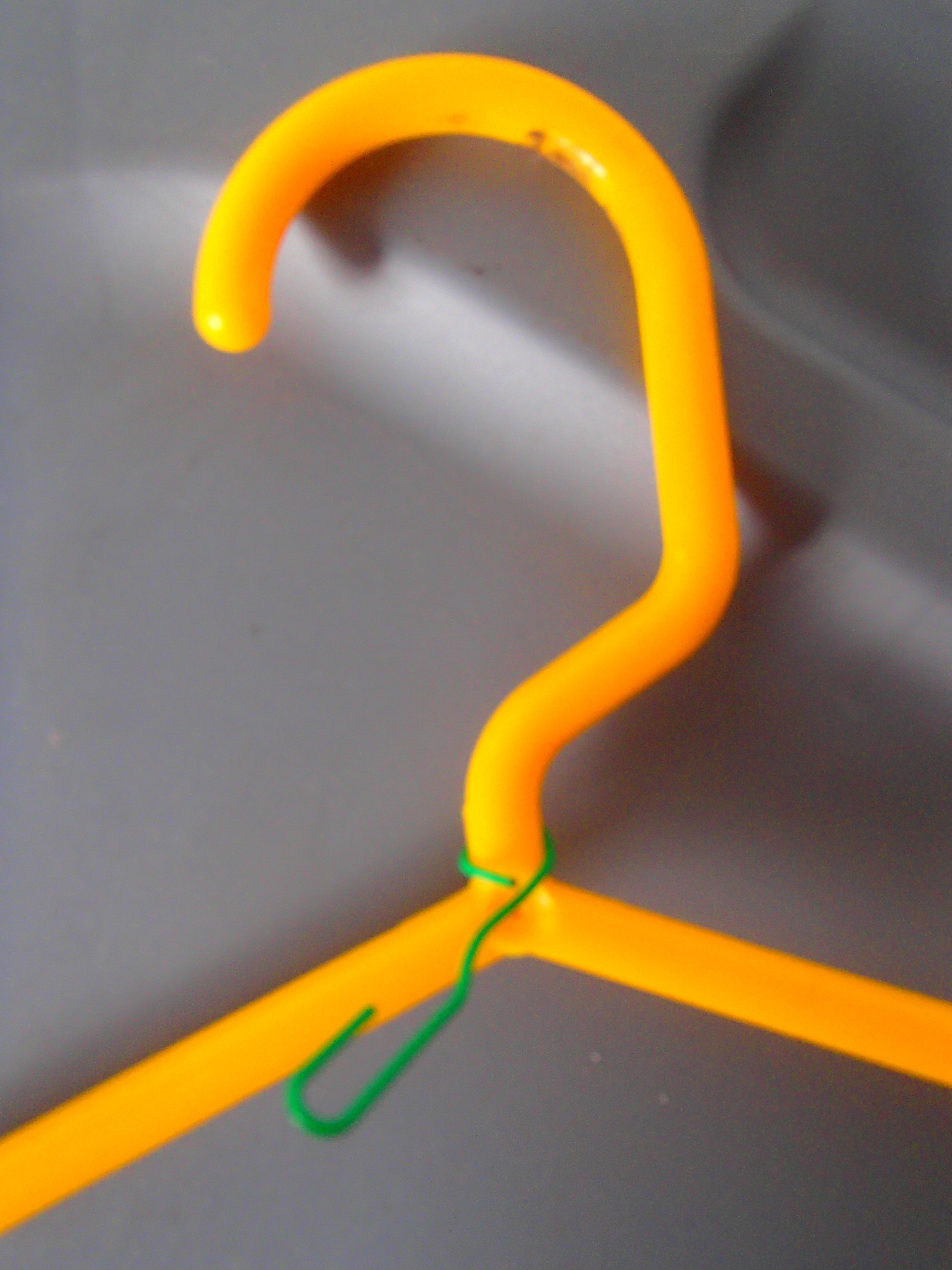 Step 3: Hook the top of the unbent paper clip around the hanger’s hook and bend the metal so it grasps the hanger firmly.