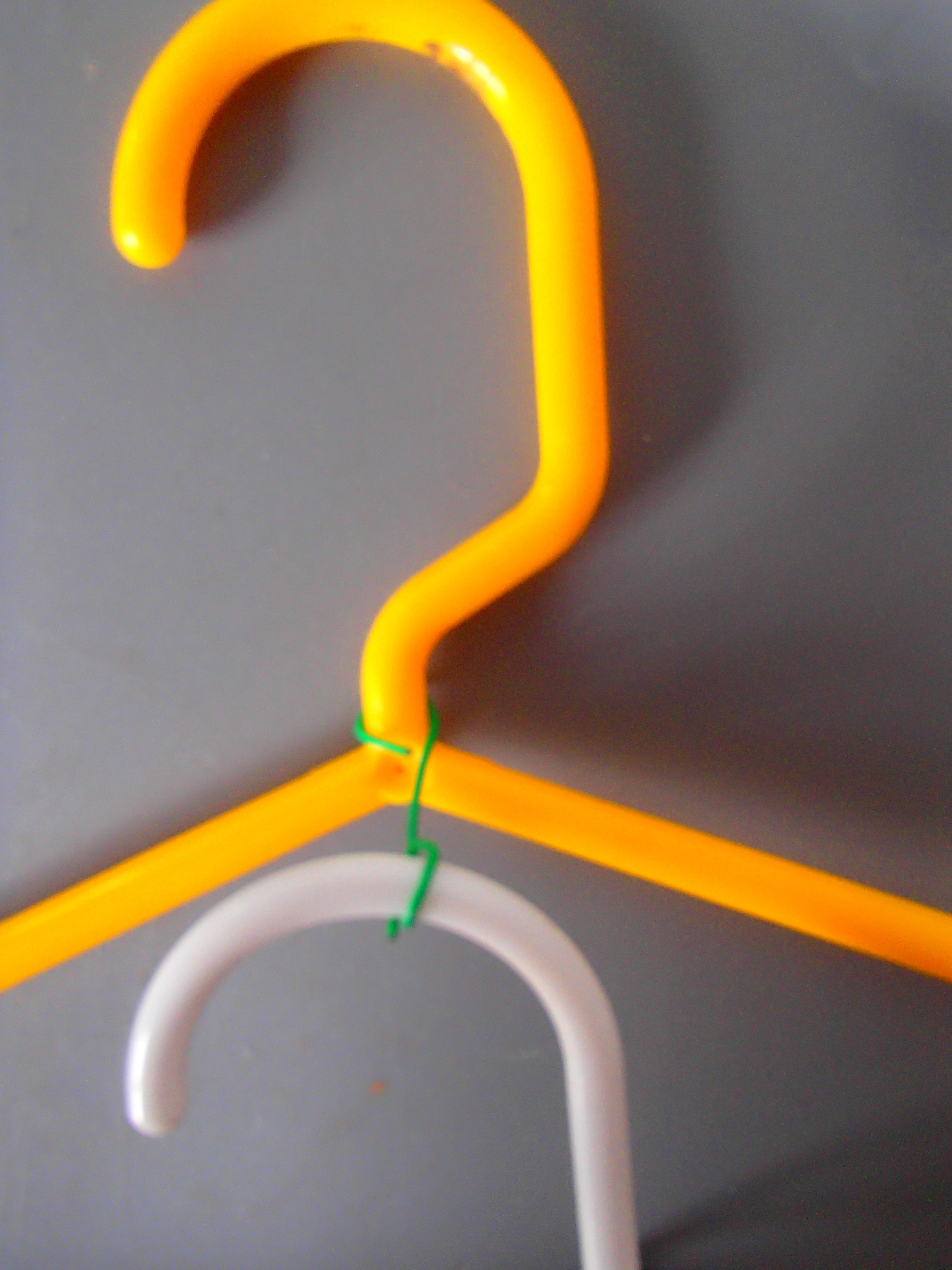 Step 4: Take a second hanger and bend the remaining metal on the paperclip around the hook of the second hanger.