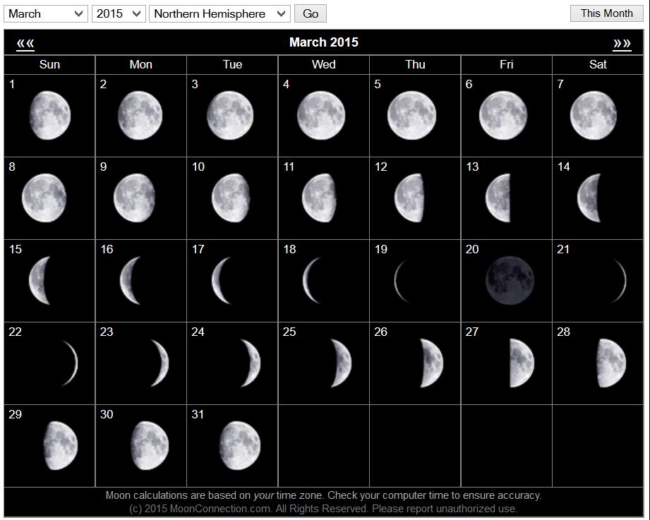 And for those of you in the Northern Hemisphere, here is the lunar calendar for this March, courtesy of MoonConnection.com: