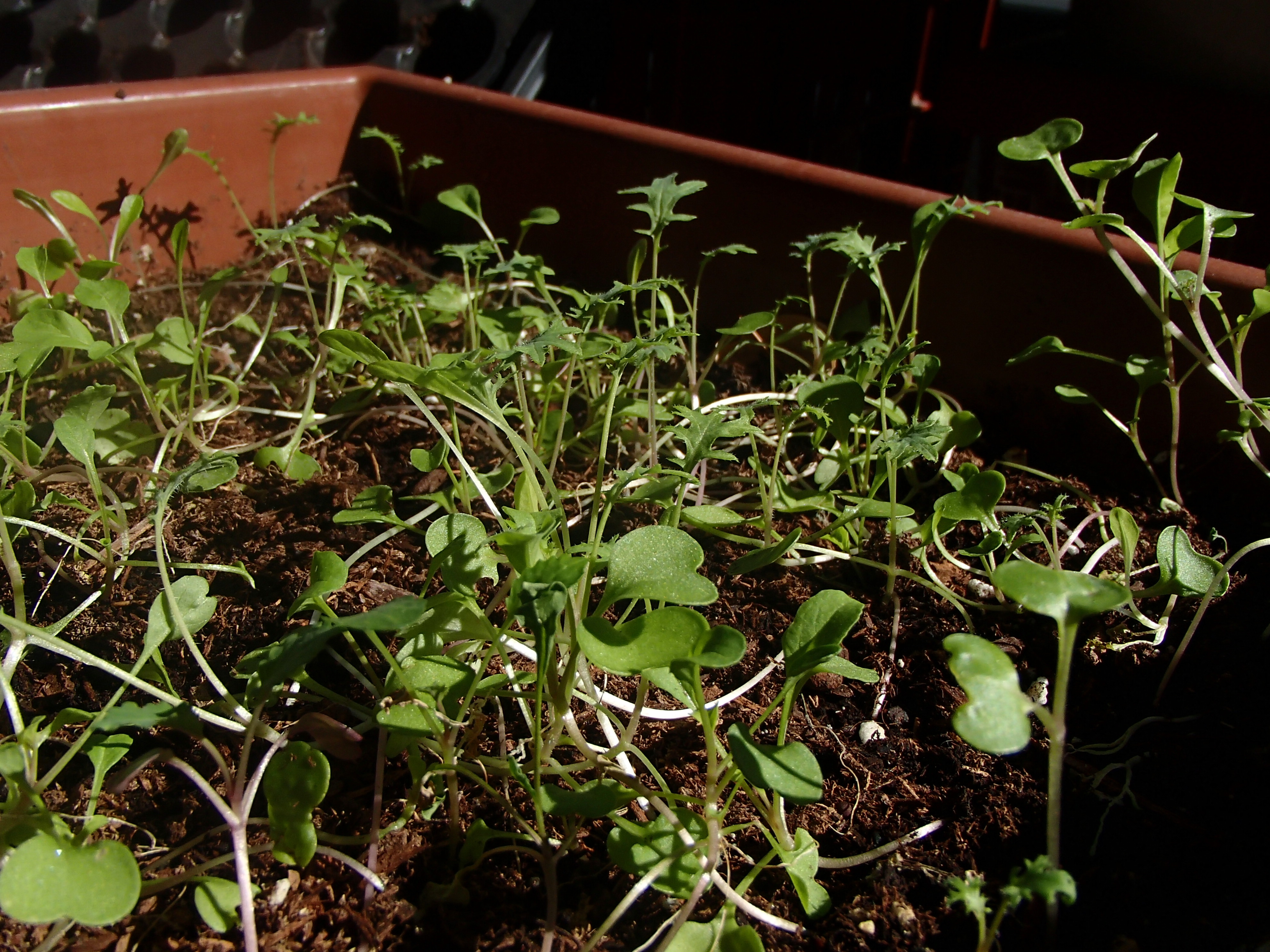 These beautiful little seedlings are a mixture of Arugula, Kale and Lettuce. They survived being left outdoors at night too early in the springtime and a pretty harsh thinning of their siblings, yet they are flourishing in the rays of the sun.