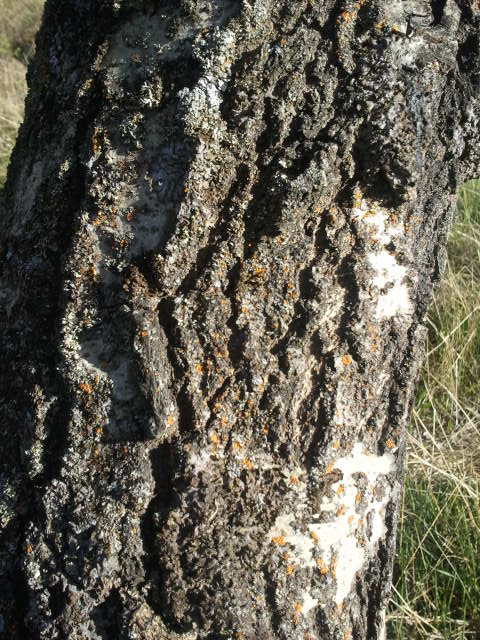 The tree has rough bark which turns into nice white sheets in the summertime and it has grass all over its feet! I love the texture of the tree.