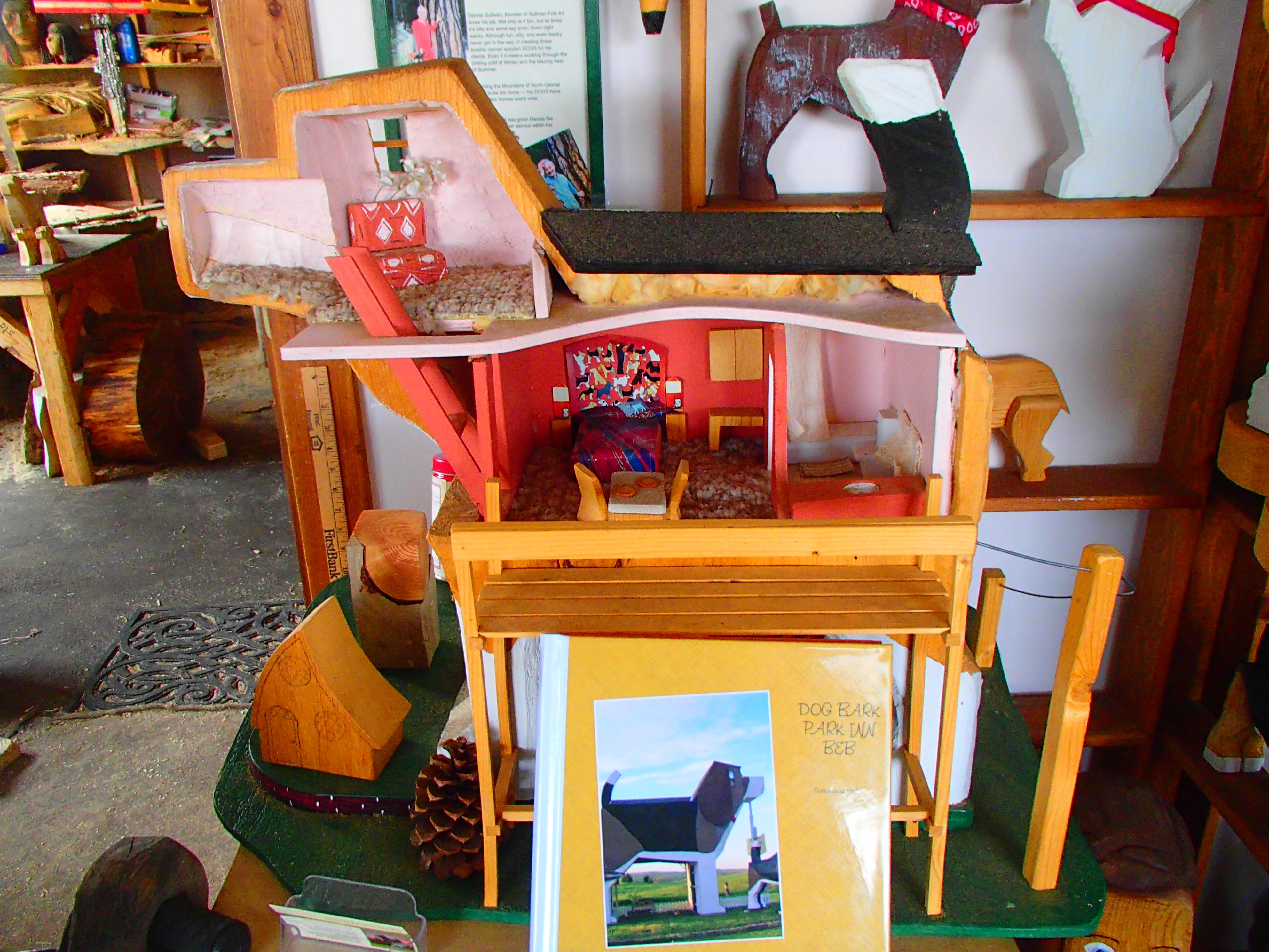 When you enter the Dog Bark Park gift shop you can see a mini replica of the dog and see where the sleeping area, loft and bathrooms lie. Hint: it’s pretty obvious since it’s a dog. The “brains” in the top are the loft, the belly of the beast is the bedroom and the bathroom runs right down the tail end.